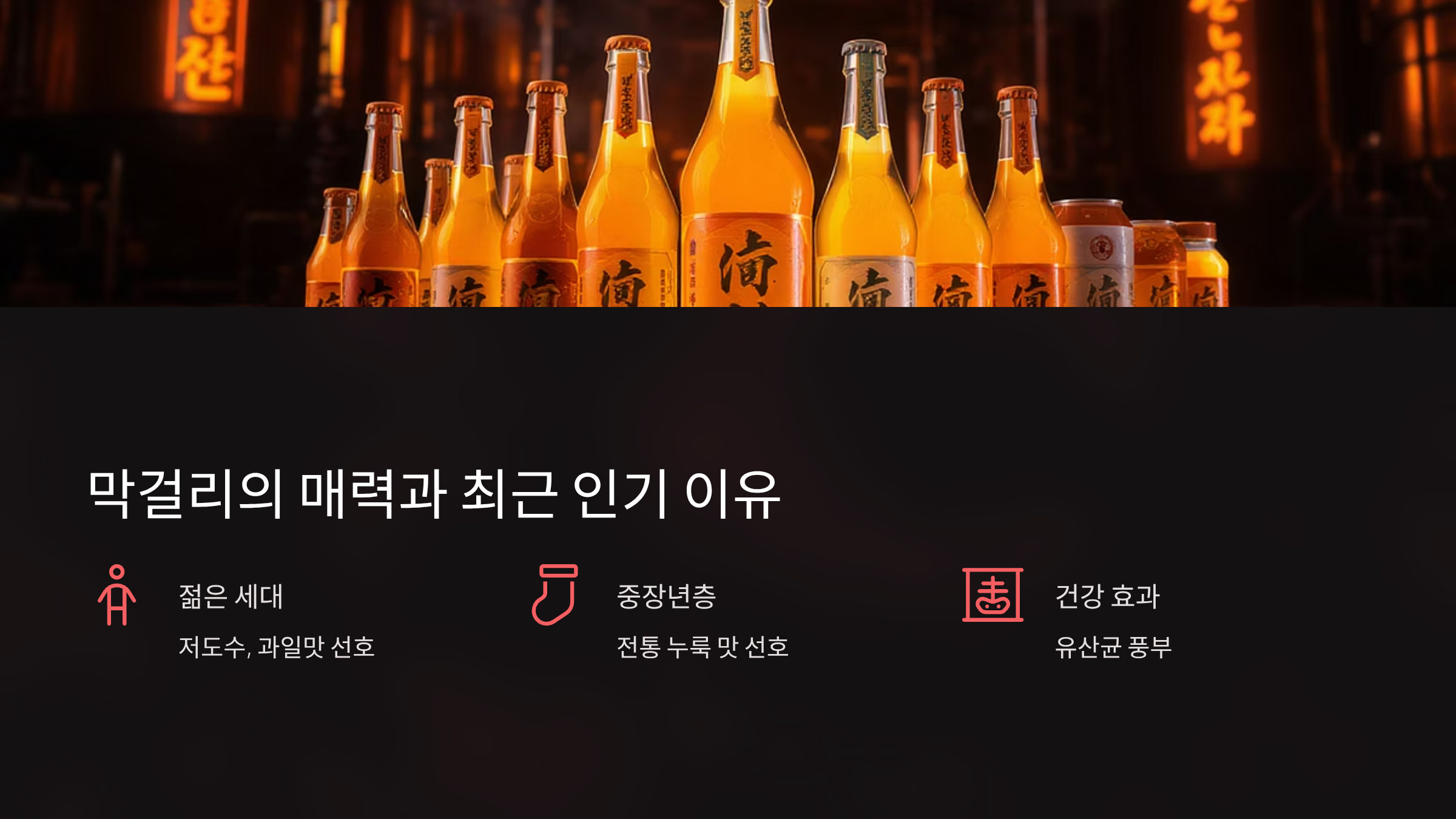 막걸리는 부드럽고 달콤한 맛 덕분에 많은 사람들이 좋아해요. 요즘엔 전통주 열풍이 불면서, 전국의 로컬 양조장에서 만든 막걸리가 큰 인기를 끌고 있습니다. 특히 젊은 세대는 저도수 막걸리나 과일맛 막걸리를 좋아하고, 중장년층은 전통 누룩 맛이 강한 막걸리를 찾는 경향이 있어요. 막걸리는 유산균이 풍부해서 건강에도 좋다고 알려져 있죠.